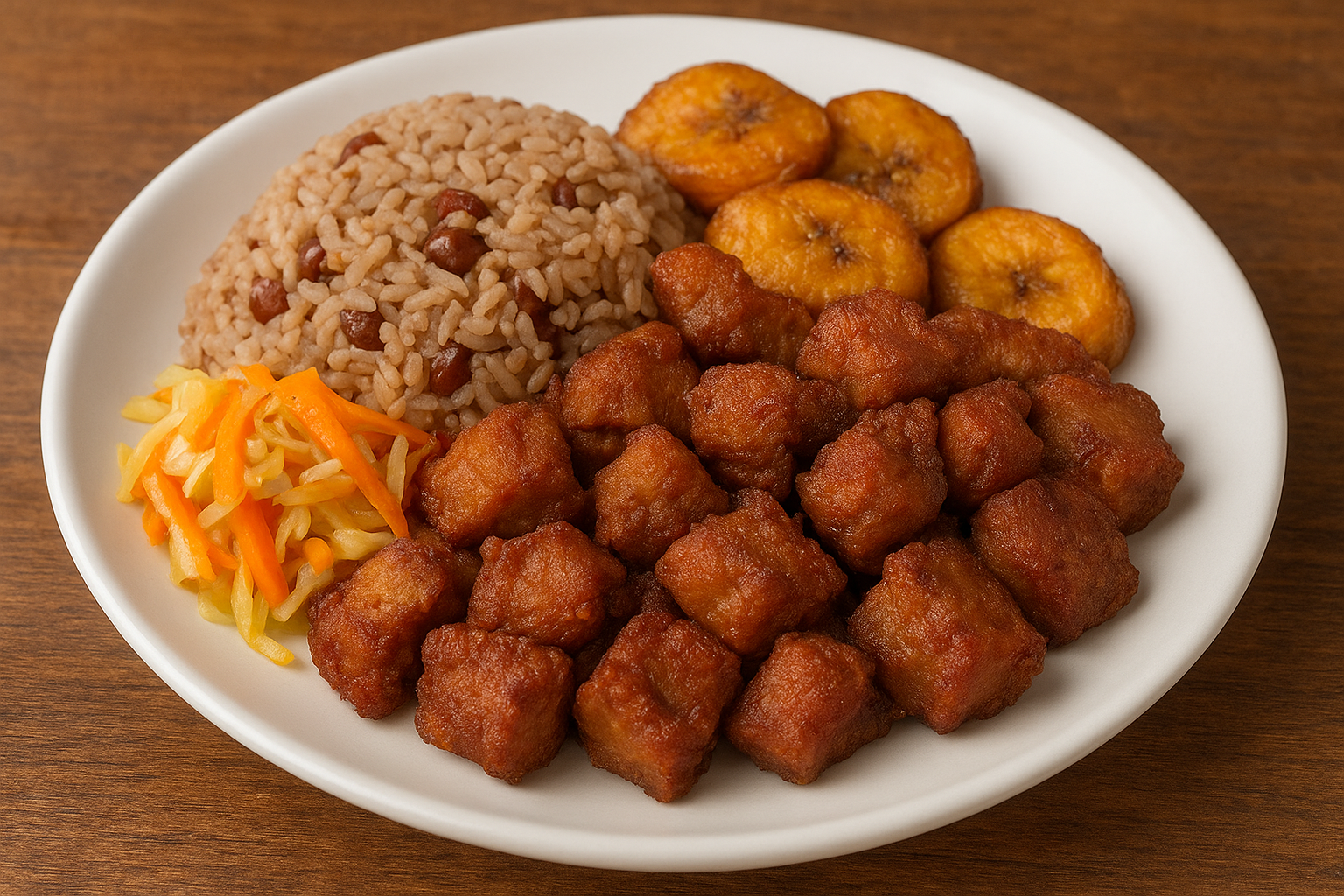 Porc frit croustillant, plantains, riz collé et pikliz
